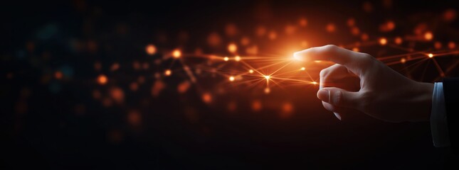 Human hand interacting with an abstract digital network, symbolizing global connection, data transfer, and future technology
