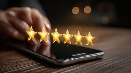 Hand placing a glowing golden star in a five-star rating sequence with additional satisfaction icons against a dark background, symbolizing quality and positive feedback