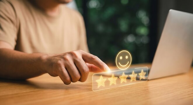 Customer Experience Satisfaction: A person's finger touches a smiling face icon on a laptop screen, symbolizing excellent customer service and positive feedback, showcasing a star rating system.