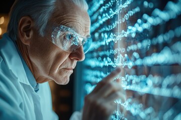Senior scientist meticulously examines complex data displayed on a futuristic interactive screen.