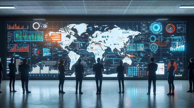 Futuristic digital dashboard with global analytics and data visualization