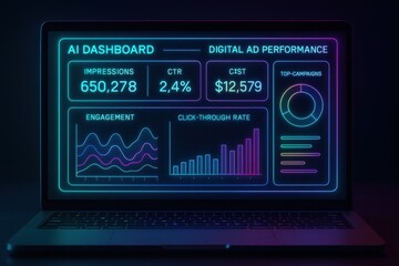 Neon candlestick chart visualizing market trend on digital finance dashboard with icons