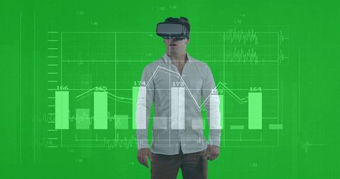 Businessman wearing vr headset exploring interactive augmented data visualization dashboard