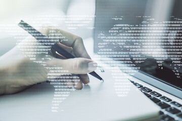Abstract creative world map and hand writing in notebook on background with laptop, international trading concept. Multiexposure