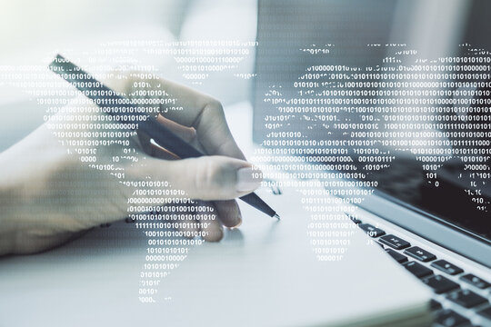 Double exposure of abstract digital world map with connections and man hand writing in notepad on background, big data and blockchain concept