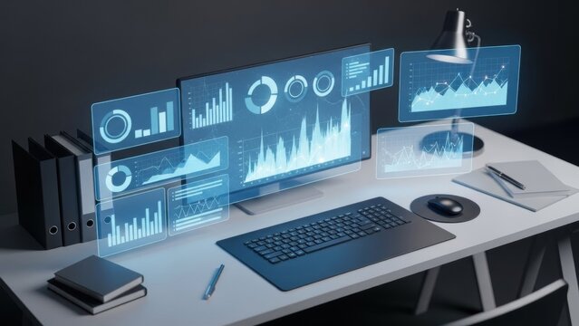 Futuristic Workplace with Interactive Data Visualization Display, A Modern Workspace Displaying Advanced Business Analytics Tools