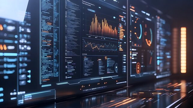 Futuristic digital analytics dashboard with holographic interface