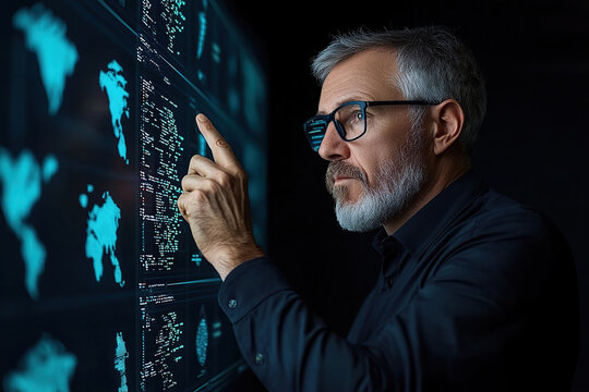 Hand with stylus interacting with multiple holographic dashboards for real time data analytics business monitoring and decision making