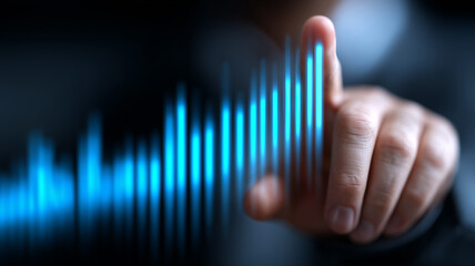Hand interacting with a glowing orange digital line graph on a futuristic blue and black data interface, representing data analysis and technology