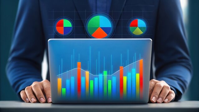 Digital 3D holographic financial bar and line charts glowing in blue and orange colors over a touchscreen device interface displaying dynamic data analysis