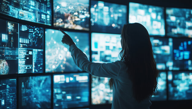 A businesswoman is pointing at multiple screens displaying data and analytics in modern workspace. atmosphere is dynamic and tech focused, highlighting her engagement with information
