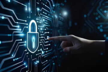 Digital interface with hand pressing lock icon, shield symbolizing cybersecurity and data protection on black background.
