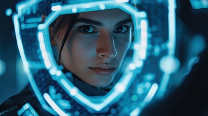 Secure Concept, futuristic workplace concept showcasing safety and security with glowing holographic shields.