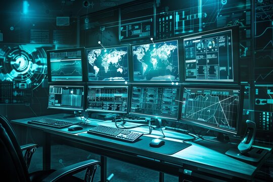 High-tech data center with digital composite displays networking concepts