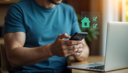 Person Using Smartphone and Laptop on Desk with Smart Home Icon Hologram in Teal Shirt in Modern Workspace Showcasing Home Automation, Digital Lifestyle, and Technology Integration