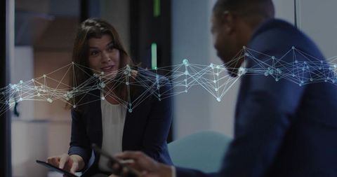 Hybrid workplace: professionals analyzing data with futuristic tech