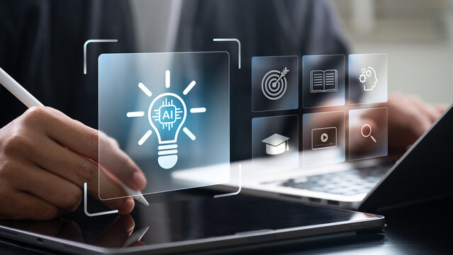 Smart education technology with AI powered idea creation, interactive learning icons, and digital knowledge tools used on tablet for personalized study and future ready training experience