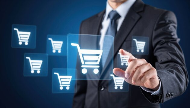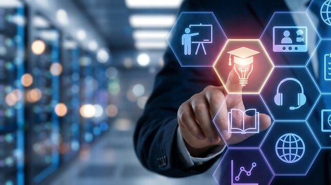 A businessman interacts with digital education icons in a modern server room, representing innovative learning and technology in a professional setting.