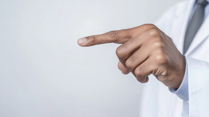 Person in White Coat Pointing at Interface