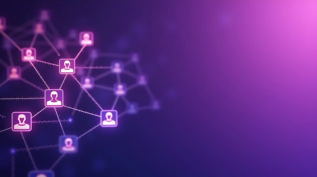 Abstract digital network visualization with glowing icons connected across a world map, representing global communication, connectivity, and technology.
