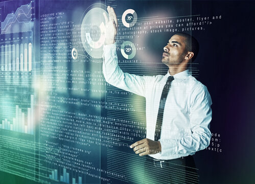 Man, touch and overlay in office for finance, cryptocurrency and interactive dashboard at night. Working late, trader and future tech in hologram for market research, innovation and investment data