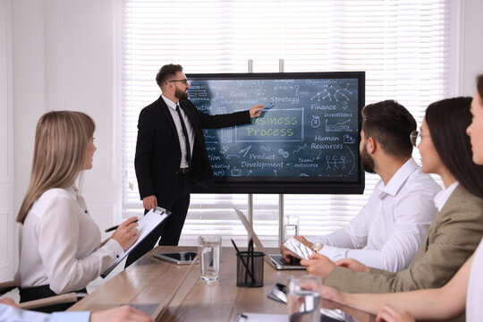 Male statistician use interactive whiteboard presentation touchscreen to look at charts in creative office.