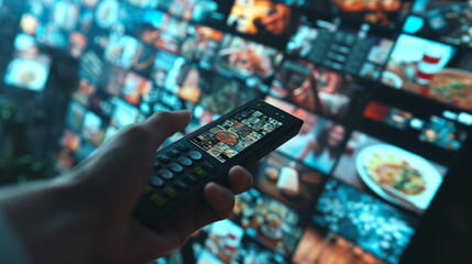 hand holding a television remote control, pointing at a wall of screens displaying a variety of food images.
