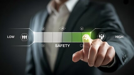 Businessperson s finger activates a digital slider indicating high safety levels on a futuristic interface