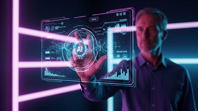 A man interacts with a glowing "AI" holographic interface, surrounded by neon lights in a futuristic setting.