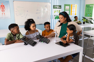African American teacher with children showing wind turbine, solar panels and tablet in classroom