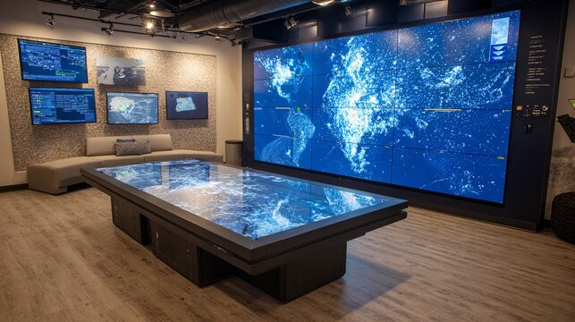 A spacious and futuristic office space that blends advanced technology with elements of nature. In the center of the office, an interactive touch screen table surrounded by comfortable. Generative AI.