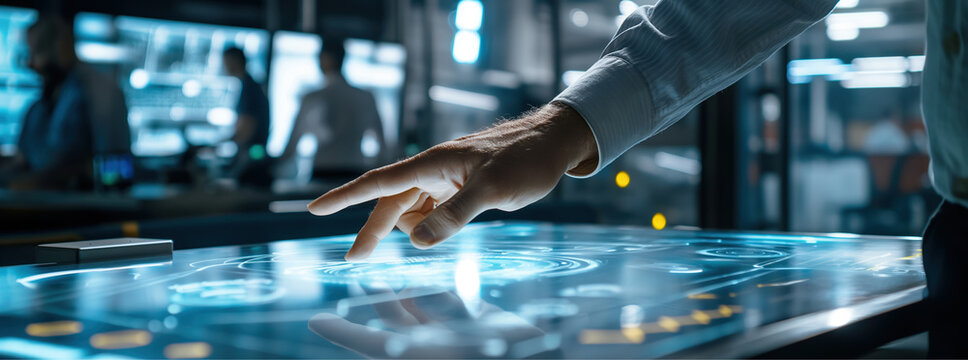Hand using futuristic touch screen table interface, modern technology, blue neon light, innovation, interactive digital surface, smart workspace