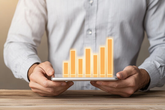 person in white shirt holds tablet displaying glowing bar charts, symbolizing data analysis and business growth. wooden table adds natural touch to modern technology scene