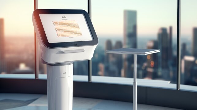 A modern, sleek kiosk with a touch screen display stands in a contemporary office setting.