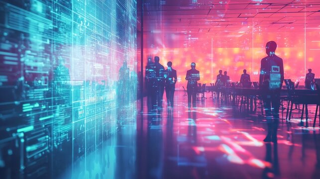 Professionals gather in a futuristic room illuminated by digital maps and data projections, engaging in discussion about global markets and technology trends. The ambiance is vibrant and dynamic.