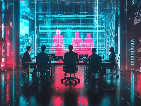 Visionary leader discussing future trends with a hologram projection, futuristic business setting