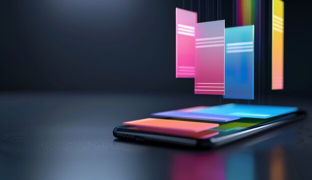 A smartphone with colorful web pages floating above it