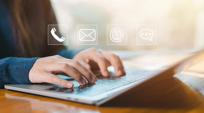 businessman using a laptop contact customer support, show icon ( address, phone, email, mobile, call ) contact us a concept. help from mail websites digital technology of business contact service