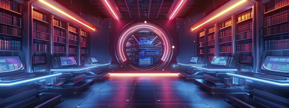 Futuristic neon public library with digital books and interactive learning zones in style.