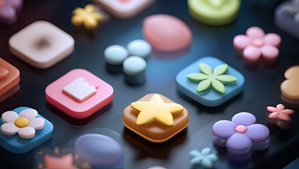 Colorful app icons, 3D rendered,  on a dark background.  Abstract,  cute,  digital