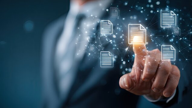 Professional in a suit interacts with a futuristic holographic interface, marking a checkbox. Concept of digital transformation and business innovation