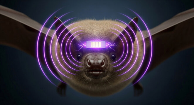 Interceptor Bats flying in darkness with glowing lilac light emitted from their head chip and surrounding rings