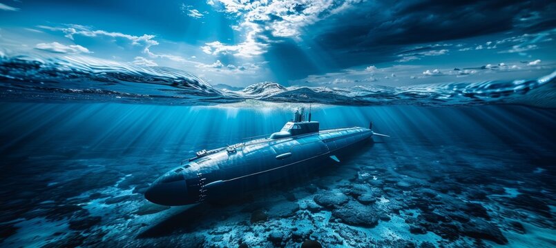 Military nuclear submarine launching torpedo missile in vast expanse of open ocean