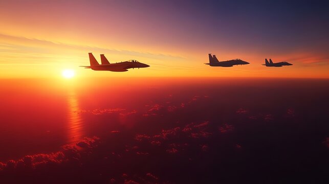 Three fighter jets fly in formation at sunset over a cloudy sky.