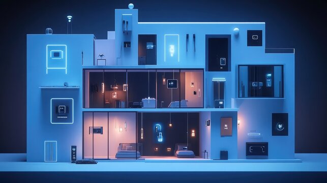 Smart Home Technology: Illustrate a smart home with interconnected devices, like voice-controlled assistants, smart lighting, and security systems, showcasing the convenience of modern living.