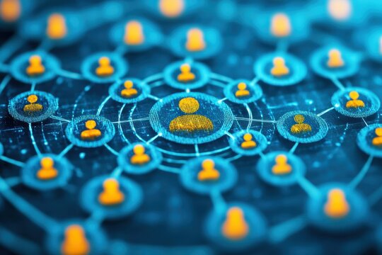 Abstract representation of digital networking and social connection with interconnected user icons and glowing nodes on a futuristic background