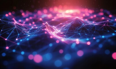 Abstract digital landscape composed of glowing interconnected nodes and lines in blue and pink hues creating a futuristic, vibrant network effect