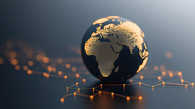 digital globe with interconnected lines representing global connectivity and data exchange. globe features detailed map of Africa, illuminated by glowing points