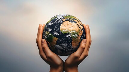 A vibrant, interconnected globe showcasing diverse cultures and landscapes, symbolizing unity and harmony among people. The globe is surrounded by hands of different skin tones, gently cradling
