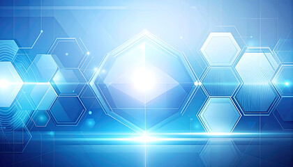 Abstract blue background featuring a futuristic pattern of interconnected glowing hexagons, representing technology and networks.